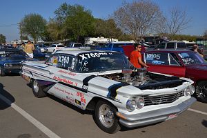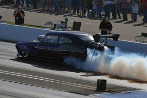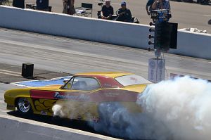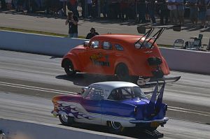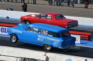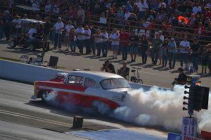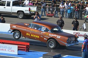 A standard bodied '56 Chevy of Pete Cogswell runs a supercharged alky engine in A/Gas.