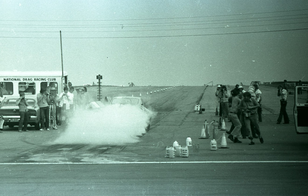 Andy Kitson remembered there were complaints from circuit racers who raced on the short circuit as shown, week in week out. "The bleach box was right on the braking and turn in point for Woodcote corner, and was left very slippery after a drag meeting, creating a safety issue. As Silverstone was/is owned by the British Racing Drivers Club, many members and committee members would race on that circuit regularly".