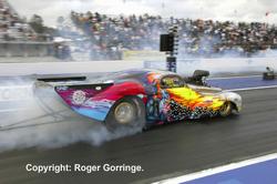 Into round one and it was a battle between Mike Neff and Tim Wilkerson with Neff loose at one-thousand foot losing with a centreline crossing disqualifier as Wilkerson notched up the win with a 5.072/290. Bob Tasca lll smoked the tyres on his attempt slowing to a 5.389/261 as Jim Head got the win light with a 4.903/300. Old team mates of Gary Densham and John Force faced off and it was Force that felt the tyres go away at half track slowing him to a 7.042/124 as Densham put on the win light with a clean 4.912/304. A better leave by Tony Pedregon helped his win; a 4.861/317 beat the 4.931/316 from Jerry Toliver's try. Ron Capps fell victim to tyre smoke at half track as they hazed to a losing 5.822/171 only for him to witness opponent Cruz Pedregon suffer almost a carbon copy of his brother Tony's explosion at Pomona, cylinders went away, a quick flash fire and boom the body almost joined the space-race but he took the 4.866/310 win. A return to competitive seat time had Frank Hawley register a 4.898/321 but losing to Jack Beckman's 4.866/320 winner. Del Worsham had his Monte Carlo mainly in K&N Filters colours and took the round win despite hazing the slicks at half track, 5.331/290 as Robert Hight in the other lane got loose as well and shut off as he got close to the centreline, slowing to a 5.636/195. Scott Kalitta went up in smoke about sixty feet out and slowed to a 13.385/74 as Ashley Force in the other lane got loose at the three quarter mark going all over her lane but wrapping up the win, 4.984/290. Del Worsham smoked away his chances at the one-hundred foot mark allowing Gary Densham the win with his slowing 7.668/118 to the 12.801/70 lose. A small problem with the Christmas tree stopped the next pair (Jim Head and Cruz Pedregon) in their tracks and they had to return to refuel and come out later. It was a simple timing repair and Jack Beckman and Tim Wilkerson were next up, Beckman leaving first chased by Wilkerson who ran him down scoring a 4.848/322 win against the 4.957/307 try. The last of the team Force cars came out in the shape of Ashley Force but she was first into smoke and got crossed up as did Tony Pedregon at half track but the pedalfest continued down track with Pedregon getting the better result in a 5.982/239 win against the 6.506/169. With Head and Cruz Pedregon refuelled the wait was worth it as Head left first quickly followed by Cruz and in a classic battle Jim Head triumphed with a 4.936/318 to the close 4.983/308. Jim Head's luck disappeared when he blazed the slicks one hundred feet out as he chased Tony Pedregon's better leave, with the latter retaining the win with a slowing 5.034/308 to the really slowed up 14.623/63 lose. Tim Wilkerson's good fortune also deserted him as his close race with Gary Densham left him with the 4.925/318 losing ticket as Densham ran the winner with a 4.964/311. Gary Densham had made a late decision to enter the Florida race and his efforts proved good enough for the Racebricks backed '08 Impala giving a good account of itself against the might of Tony Pedregon's Q Horsepower Impala. It was a classic race as Densham chased Pedregon up track and despite Tony getting close to the wall after he had taken the event title Gary recorded a 4.924/309 to the 4.921/315 winner.