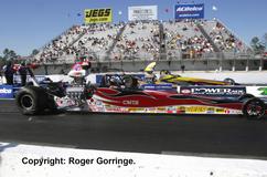 Larry Dixon opened the Sunday eliminations with a 4.592/314 win over Doug Herbert's very close 4.598/322 lose. Another reasonably close contest saw Brandon Bernstein wrap up his second round place as his 4.593/328 beat the 4.623/322 from Clay Millican. Hillary Will once again began turning up the speed numbers with best of 330.63 mph coupled with a 4.582 to oust Cory McClenathan's 4.619/318. FIA European Champion, Switzerland's Urs Erbacher came off the throttle with problems slowing to an 8.386/102 leaving Rod Fuller to get the win with a 4.590/325. Alan Bradshaw's earlier qualifying luck deserted him as he went into instant smoke and despite trying to pedal slowed to a 8.386/103 only to watch Bruce Litton charge to a 4.655/323 win. Antron Brown notched up another round win when he despatched Doug Foley with a holeshot 4.604/327 to the blower belt losing 4.928/217. It was Dave Grubnic this time that fell victim to the instant smoke, recording a given-up 11.723/78 as Michael Gunderson reaped the reward with a 4.722/305 win. The last pairing of round one was Tony Schumacher against J.R. Todd with Todd leaving first then burying the slicks in smoke as Schumacher drove by to record the win with a 4.612/314 to the slowed up 9.647/87 try. Round two opened with Tony Schumacher getting the better of Antron Brown as the latter hit tyre smoke at sixty feet out and slowed to a 9.495/68 lose as Schumacher charged to a 4.596/320 win. Michael Gunderson's day ended with a loss in the pedal fest with Brandon Bernstein, Gunderson hit smoke first then Bernstein both pedalling for all they were worth but Bernstein regained enough to click the win light on with a 6.782/218 to the losing 8.135/135. Hillary Will continued well getting past a tyre hazing at half track Rod Fuller and wrapping up the 4.694/316 win to the 5.305/200 try from Fuller. Bruce Litton's day ended with a slowed up 10.587/86 as Larry Dixon took the win with a 5.112/268. Down to the last four in the semi finals and each pair gave it their all in an attempt to reach a finals placing. Brandon Bernstein left first in his bout with Hillary Will in the KB Racing/LLC machine and put her out as his 4.666/322 carded the win to her losing 4.672/325. Larry Dixon in his attempt in the U.S. Smokeless Tobacco car oiled the top end of the track when his 4.850/274 was just not enough to beat the 4.741/304 from Tony Schumacher's car. Finals time and the last pair to go down the track in front of the capacity crowd and the live TV audience and it was no holds barred as the U.S. Army dragster of Tony Schumacher left a tad before the Budweiser King/Lucas Oil car of Brandon Bernstein and held on to take the all important title with a 4.603/325 to the 4.665/323.