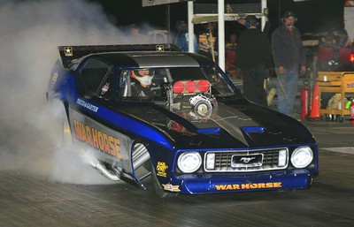 Fuel Altered provided some superb action. Four cars took to the track for Round 1, but a hard contact with the side wall following a sharp right-turn off the startline saw an early exit for Ron Maroney and his beautifully prepared and presented Super Nanook. Chris Bennett's Pure Heaven Bantam took the honours with a fine pair of passes, 6.626/166.93 and a final-winning 6.406/194.02. "Insane" is how IHRA Media Director Larry Crum described the riders of the Nitro Harleys in his pre-race release, and who could argue? Mike Scott took away the Ironman trophy for the win with a magnificent 6.867/203.89 blast into the darkness over previous points leader Steve Dorn. Following the weather-delayed March Meet the previous weekend, the trip to Tucson was just a short hop for Pennsylvania-based Peter Gallen, and the Poverty Stricken Vega continued a run of fine performances to carry off the Prostalgia Funny Car win over fellow East-Coaster Mike McIntyre in the magnificent McAttack Z28 Camaro. Gallen's 5.777/250.97 effort, to McIntyre's very close 5.808/232.39, won the team a new ET record for the class and with it another Ironman trophy. Once again it was Lagana's day, the newly-sponsored Lucas Oil car taking the Top Fuel win for the second time on the weekend with a fine 4.772/311.03. Another double for Chris Bennett in Fuel Altered, this time with an uncharacteristically arrow-straight charge for the line, completed in just 6.442 seconds at 214.28 mph. Runner-up Jason Richey, also sporting a Bantam body, completed the lap with a slower but equally direct 6.921/217.63. The boot was firmly on the other foot this time aroundin Nitro Harley, with Steve Dorn stamping his authority over the previous night's winner Mike Scott. Off the line both bikes enjoyed good clean runs, and it was a close-run thing too, Dorn taking the startline advantage with a 7.102/207.59 to Scott's 7.161/210.87. Other classes