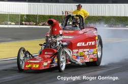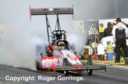 In round one Brandon Bernstein blew the tyres off against Morgan Lucas, the following bout was a good race as the 3.830/318 from Doug Kalitta saw off the 3.831/317 charge from Steve Torrence. The left lane then suddenly went sour as TJ Zizzo then Bob Vandergriff blazed the tyres against Shawn Langdon and Del Worsham respectively. Ron August Jr continued the blazing lane losers as Spencer Massey put down a 3.782/324. Troy Buff fireballed as Schumacher took the light in their pairing. Mike Strasburg clicked off early with problems as Brown went through and finally, in a huge upset, Larry Dixon slowed to a 4.486/223 as Terry McMillen fireballed another motor but took the win with a 4.188/207. Round two opened with McMillen tossing a blower belt to end his day, a 3.945/266 against the winning 3.858/317 from Lucas. Kalitta suffered a big engine detonation at three quarter track losing the race with Brown, 3.828/320 to 4.373/190. Worsham continued to impress in his new ride with a 3.810/322 win over a tyre hazing at half Massey. Another shock occurred when Schumacher blazed the slicks at half track and despite pedalling lost with a 5.375/127 to Langdon's 3.841/309 to end the round. The semis kicked off with Antron Brown in the Matco Tools/US Army car suffering a big fire and oiling the track from the halfway mark as Shawn Langdon charged to the win with a 4.033/313. Del Worsham's luck in the Al-Anabi car ended when his 4.291/186 was not enough to hold off the 4.049/220 from Morgan Lucas. The final pitted the two team cars of Morgan Lucas in the Geico Powersports/Lucas Oil machine against Shawn Langdon in the Lucas Oil Fueller and it was Langdon away first only to be reeled in by Lucas with a winning but fiery 3.835/316 to the 4.047/313.
