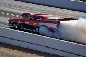 A standard bodied '56 Chevy of Pete Cogswell runs a supercharged alky engine in A/Gas.