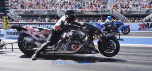 Tutterow red lit in round one against no 16 qualifier Jose Gonzales. Reigning Champion Mike Janis 5.879 lost a close race to No 14 qualifier Bob Rahaim 5.872. Sidnei Frigo ended Jackson weekend in round two. In the semi-final Frigo motor blew at track against Rahaim. In the other semi Enders lost to Gonzales 5.850/256.02mph to 5.906/256.21mph. Gonzales won the event when Rahaim's motor started to smoke and lose power at the finish line. Top Fuel Harley. There was a good entry for round six of the Mickey Thompson Tyre Top Fuel Harley race series. Twelve bikes competed for the eight-bike eliminator. Jay Turner on his pro-charger V-Twin was the number one qualifier with a 6.319 at only 212.76mph (low et of the meet). Mike Scott just edged Series points leader Beau Layne for number two spot with 6.340/228.04mph (top speed of the meet).