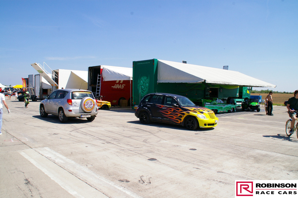 It took two full days to get to the track and because our fellow travellers were on truck driver’s tachos we had to stop regularly and park up for nine hours at night. This proved to be a problem because all the service stations were full of trucks so many in fact that it was sometimes difficult to find a way through. We ended up in a truck stop about 10 km off the autobahn. It was inconvenient but good for breakfast and a shower. Andy’s rig counted as a motor home and trailer so we paid a lot less in tolls than the Ellis truck in spite of having similar total weight. In Austria we had to buy a GO box to cover the tolls (Pic 05), this was preloaded with money and as the vehicle travelled along the autobahn a roadside display would show how much credit there still was. Fortunately my pidgin German was enough to ensure we bought enough credit for both journeys there and back. Our only other problem really was following a car sat nav which took us through the centre of Budapest, in theory not allowed for trucks over 3 tons (Pic 06). We only had to do this because the navigator (me) fell asleep and we missed a crucial turning. We finally arrived at the track in the dead of night and had to try to find the pit area in total darkness. The track itself was the runway of a Cold War bomber station which the Russians had abandoned some years before. Imagine arriving at Gatwick by a side entrance and trying to find a terminal building with no lights to guide you.
