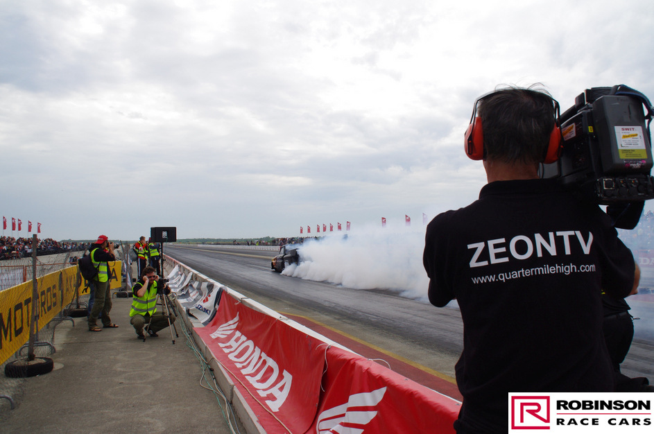 So for us too there was good news and bad. The good was a solid stable concrete track when many considered that to be a perfect surface to race on, the bad was that in spite of the visiting Santa Pod crew’s best efforts the track was green and wouldn’t hold the power of any of the demo cars. So it came down to doing long smoky burnouts – all the drivers could indulge their inner Freddies – and trying to get to the end of the track without kissing both guard rails.