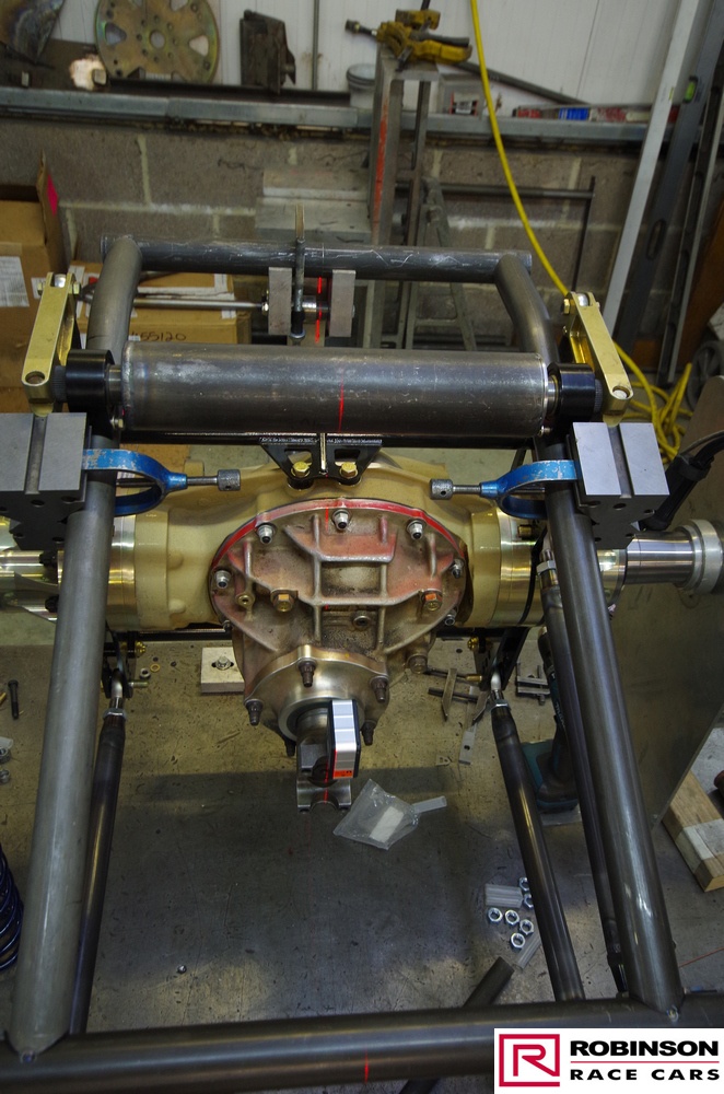 This is one of the few times I managed to capture the use of a laser to ensure correct alignment of the back axle with the engine. Picture 7 shows the red line projected by the laser on the axle and Picture 8 shows the fitting which holds the laser and mounts in the front bearing position in the engine.