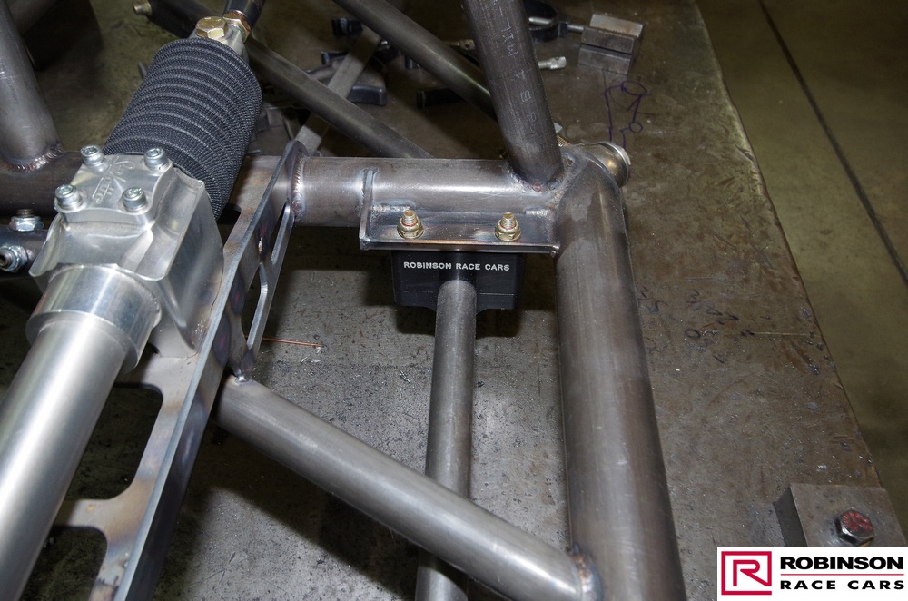 The chassis is built in Pro Mod style with a Mark Williams modular axle and anti-roll bars front and rear. The front struts are mounted on “bunny ears” up from the twin chassis tubes rather than tubes from the A-pillar to the front of the chassis. This allows for easier work on the engine such as removal of heads.