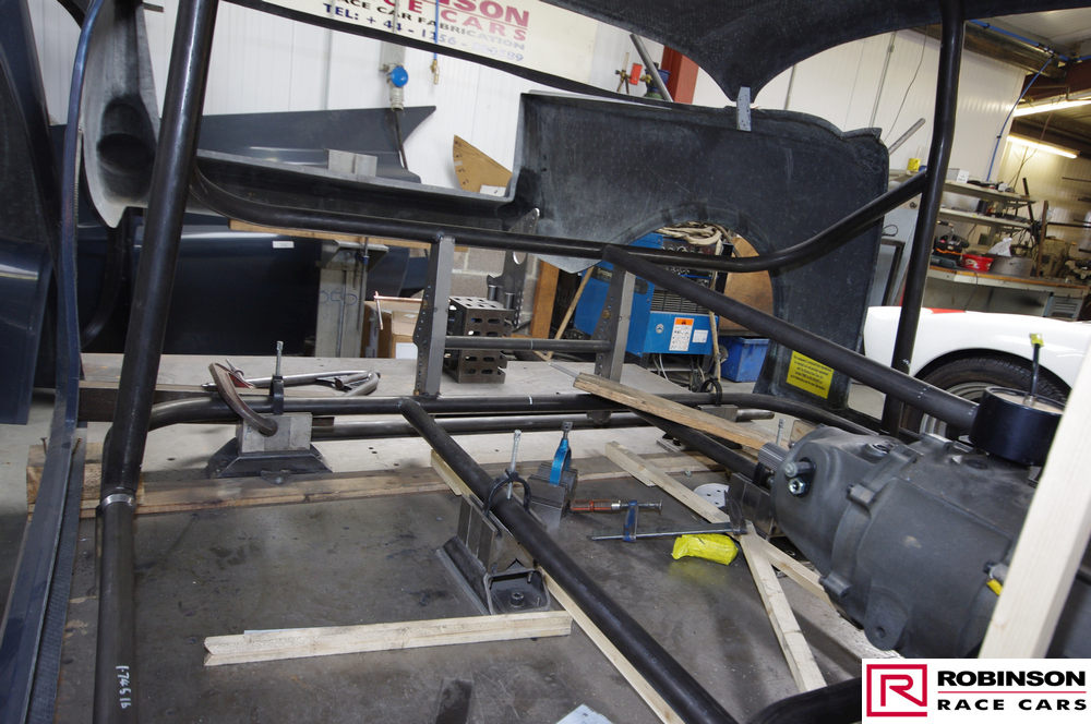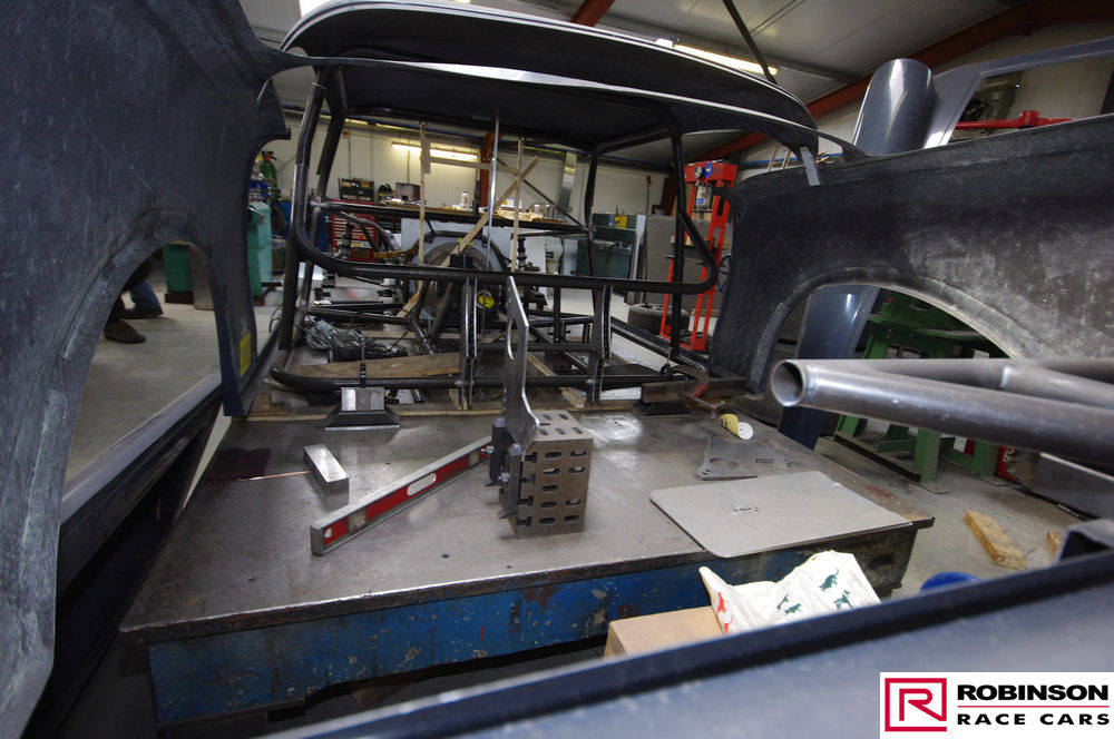 The steering rack was next (pic 15) and then the cage was created (pic 18). Front body panels were located (pic 20) and then the chassis was connected up to the underbody panels (pic 24 to 30). The rear end underbody was fitted before the seat was added (pics 31 to 33).