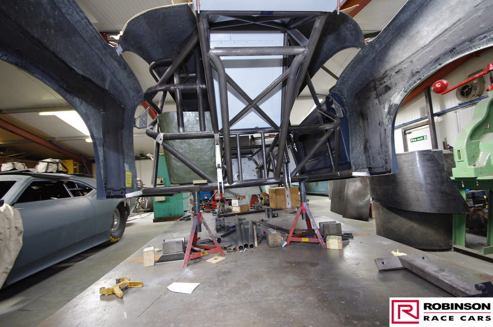 The build started with the fireglass body placed on a chassis jig with the engine located (pics 1 to 4). Front suspension followed (pic 5) and then the Lenco gearbox was located. Frame rails were added and the car began to take shape (pics 7 to 14)