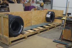 The following day I drove to Wichita and met up with a couple of internet friends and spent a few hours chatting and drinking coffee. Monday I drove to N&P and met Frank and Scott Parks who made me very welcome, I stayed most of the day taking pictures, asking questions and generally being a nuisance. They were more than helpful and even now I can E-Mail them with a question and always get a reply with help within a few hours. To my recollection about 4:00 pm we started loading the Dodge with parts, it was the ideal vehicle with all five back seats folded flat into the floor. Four wheels, four tyres, complete axle in parts, brakes, steering, carbon fibre seat, cowl and nose, bent tubes, parachutes and plenty more. I set off back to my hotel and got my head down as I had planned to go back to N&P and ask all the questions which I hadn't on the first day and then set off for my first stop in St Louis, Illinois en route to Franklin in Tennessee, the idea being I would drive about 275 miles the first day and then the other 425 miles the following day. With all the best-laid plans I awoke to snow the next morning, only a light dusting of powder but it was very cold and the forecast was for lots more snow that day. I left about 6:30 am having decided not to call back to N&P and see how far I could get before the snow stopped me. Little traffic helped but getting out of the inside lane into the snow-covered lane to overtake the really slow vehicles was a problem. The snow continued to get worse as I drove. Passing numerous accidents including one that was probably twenty five miles of wrecked trucks and cars and seeing a great many cars leave the road in all directions. I arrived at my booked hotel early as I had foregone the stop at N&P, I stepped out of the car into about six to eight inches of the white stuff... do I stay and get some rest or do I cancel and see if I can drive out of the snow before I get stuck here? I took the latter option and cancelled my room and drove off in to the early afternoon sun. Eventually as I drove into Kentucky at about 5:00 pm the snow slowly eased off into torrential rain which lasted until I had nearly got to Nashville where it eased off. At about 10:00 pm I got to the hotel into which I was booked for the following night, and they had a room. So another long day and roughly 700 mile through snow and rain touching on six different states. I did mail Scott the following day to report in on progress and he informed me that if I had stayed I would have been snowed in as they had eighteen inches and very cold temperatures. After a good sleep I set off for my good friend Duane's house. He lived about twenty miles south of where I was staying. Over the next few days we built a crate to ship everything back to the UK. The size of the crate was based on the longest single length of chrome moly needed in the chassis and the width and height of two slicks, the tube was all in the bottom of the crate and everything else was packed in on top including two more slicks and an axle for someone else. We visited Home Depot several times for timber, bubble wrap and screws etc. By the end of the week everything was packed in including the carbon fibre cowl which we suspended on nylon cord from the top of the crate so that it did not touch anything else. We spent days building and packing and evenings chatting about the differences between the two countries: both Duane and I learned a lot about where the other lived. I flew out of Nashville back to Detroit on the Sunday afternoon where I picked up another rental car for my business trip. I spent a week in Detroit assisting with the build and sign-off of some new cars with which we ended up on the Canadian border for three weeks cold testing. On the final day we were at minus 36° C at 6:30 am when we left the hotel; at 10:30 pm the same day I got off the plane at Los Angeles airport at plus 25° C - a difference of 61° C - and began a twelve-day holiday taking in the March Meet at Famoso Raceway. I had left the UK on 1st February and got back around 17th March. After a few delays sitting about in the USA the crate eventually got put on a ship and arrived in late June 2014. Unloading it with the aid of a borrowed forklift mounted on the front of a tractor was precarious to say the least, but we got it back to my workshop somewhat battered and bruised but intact. As many of you know it's always a pleasure to unload a parcel from the States so you can imagine the fun opening a 15' x 3' x 4' foot parcel. Needless to say I am still using up the wood it was made of.